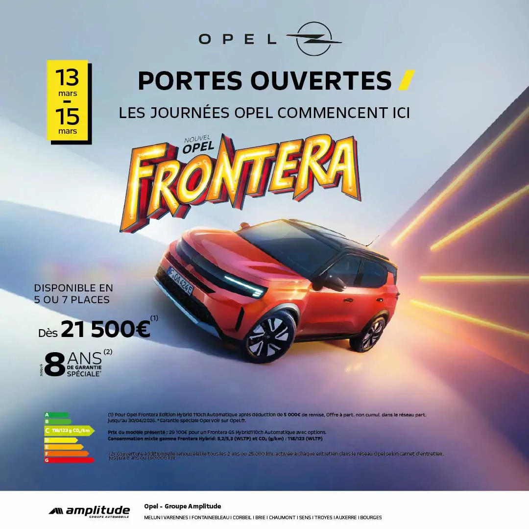 Inscrivez-vous pour être contacté par notre équipe et découvrir le nouveau Opel Frontera pendant les Portes Ouvertes du 13 au 15 mars. Réservez votre RDV et votre essais.